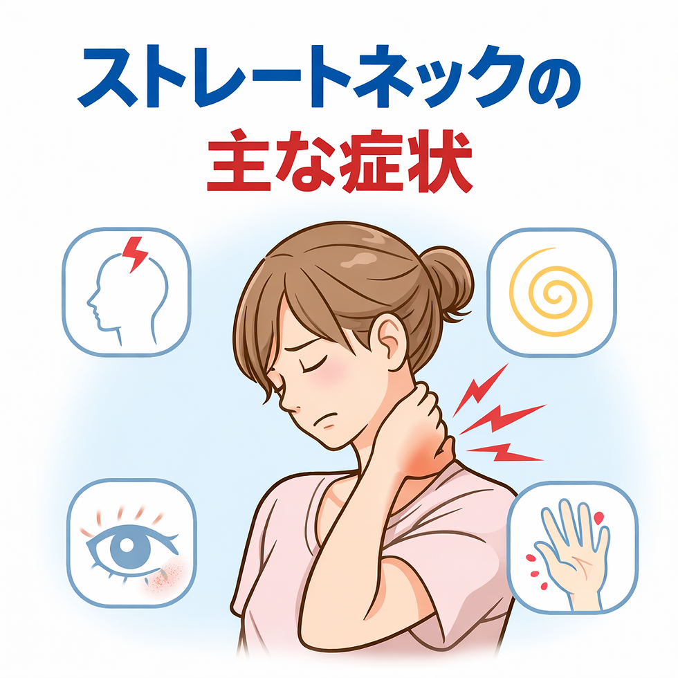 ストレートネックでは、首や肩の不調だけでなく、頭痛やめまいがみられることもあると言われています。首の筋肉が緊張した状態が続くと、血流や神経の働きに影響を及ぼす可能性があると考えられているためです。