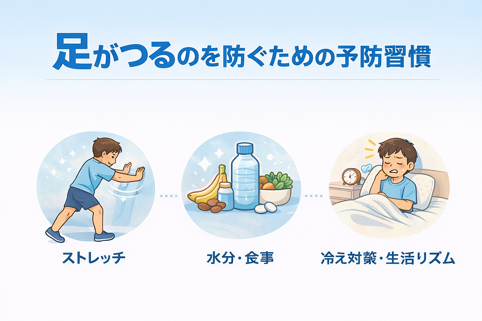 また、睡眠不足や不規則な生活が続くと、自律神経のバランスが乱れやすくなり、筋肉の調整機能にも影響が出ると言われています。寝る時間や起きる時間をなるべく一定に保つ、入浴で体を温めてから休むなど、生活リズムを整えることが予防につながる可能性があります。無理なく続けられる工夫を取り入れることが、足がつる状態を減らす一歩になると考えられています。